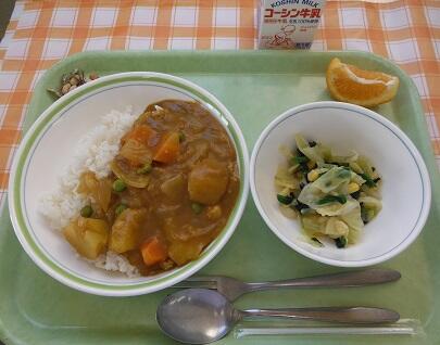 牛乳・チキンカレーライス・ほうれん草入りサラダ・いよかん・大豆小魚