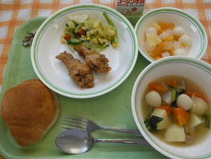 牛乳・胚芽パン・鶏肉のガーリック煮・イタリアンサラダ・ポトフ・フルーツ白玉・小魚