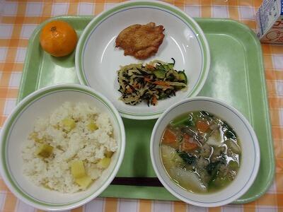 牛乳 大豆ご飯 竹輪の磯辺揚げ 辛し和え かぶのみそ汁 さつまいもとりんごの甘煮