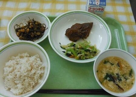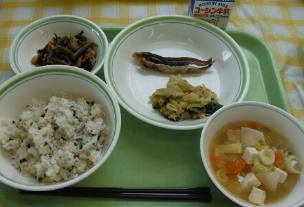 牛乳・わかめごはん・ししゃもの唐揚げ・ちんげん菜のごまあえ・大豆の磯煮・石狩汁