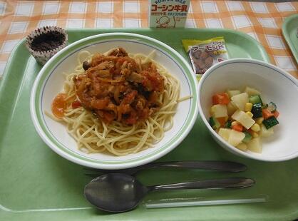 牛乳・スパゲティトマトソース・マセドアンサラダ・手作りチョコブラウニー・炒りアーモンド
