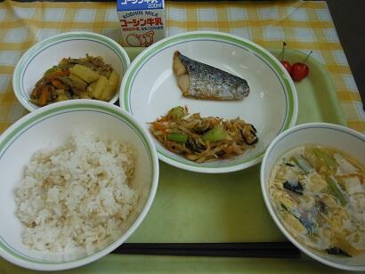 牛乳・白飯・さわらの照り焼き・おかかあえ・カレー金平・かきたま汁・さくらんぼ