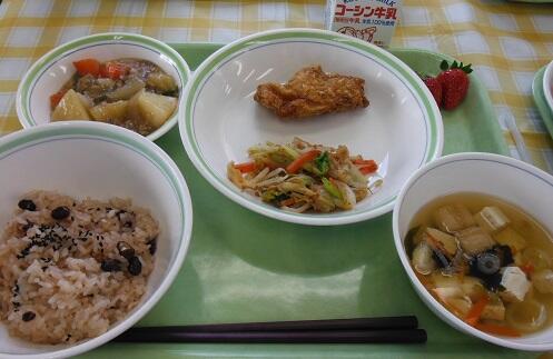 牛乳・赤飯・とりの唐揚げ・おかかあえ・じゃが芋のそぼろ煮・すまし汁・いちご