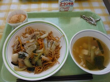 牛乳・揚げ麺の五目あんかけ・豆腐の四川風スープ・メープルマフィン・小魚