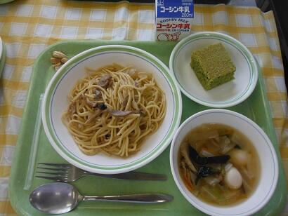 牛乳・きのこスパゲティしょうゆ味・千切り野菜のスープ・ほうれん草ケーキ・炒りカシューナッツ