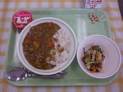 牛乳・ポークカレーライス・すき昆布のサラダ・アセロラゼリー・煎り大豆