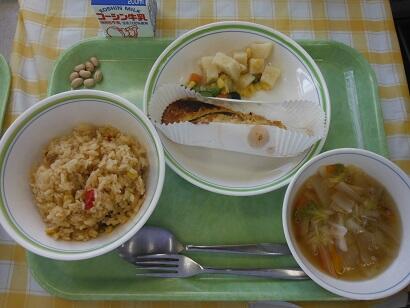 牛乳・ナシゴレン・さけの香味パン粉焼き・マセドアンサラダ・白菜とベーコンのスープ・煎り大豆