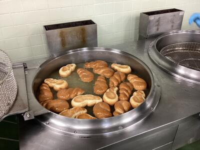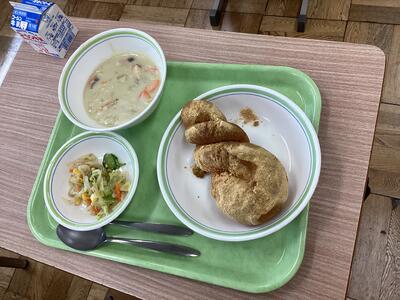 今日は「きなこ揚げパン」と「ココア揚げパン」のセレクト給食でした!事前に希望調査をし、きなこ244人、ココア347人で、ココア味の方が人気でした。教室では子どもたちの笑顔がたくさん見れました。