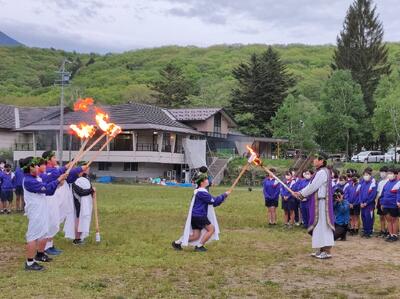 林間前から準備を入念にしていたキャンプファイヤー。火の神から火の精霊へと火が分けられて,点火。火が燃え上がりました。1組は「勇気の火」,2組「挑戦の火」,3組「笑顔の火」,4組「団結の火」,5組「全力の火」。