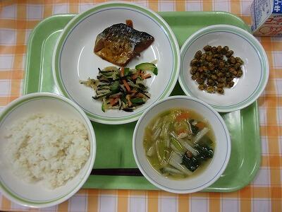 牛乳 大豆と昆布の混ぜご飯 鯖の文化干し 梅ドレッシングサラダ かきたま汁 スイートスプリング