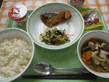 牛乳・白飯・さばの味噌煮・磯香あえ・けんちん汁・ヨーグルト・炒りアーモンド