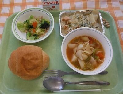牛乳・胚芽パン・さけとポテトのグラタン・ブロッコリーサラダ・ミネストローネスープ・煎り大豆