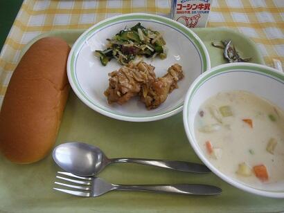 牛乳・キャロットパン・鶏肉のガーリック煮・海藻サラダ・クリームシチュー・小魚