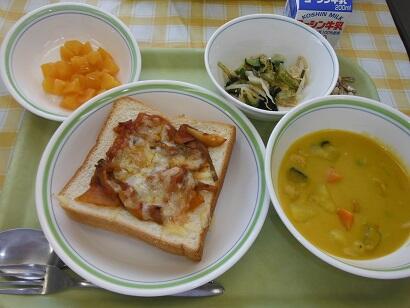 牛乳・手作りピザトースト・かぼちゃのクリームシチュー・海藻サラダ・黄桃缶・大豆小魚