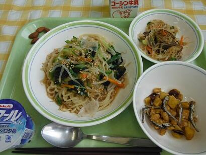 牛乳・冷やし中華・大豆と小魚と芋の揚げ煮・バンサンスウ・ヨーグルト・炒りアーモンド