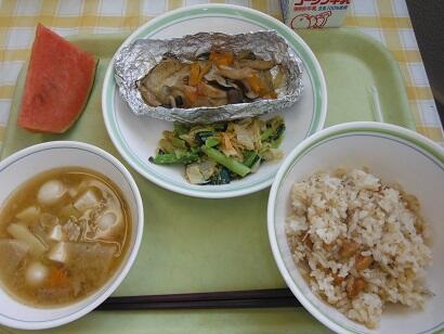 牛乳・揚げ大豆とじゃこのごはん・ホキのホイル焼き・ごまあえ・豚汁・スイカ