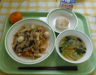 今日の給食は、揚げ麺の五目あんかけでした。