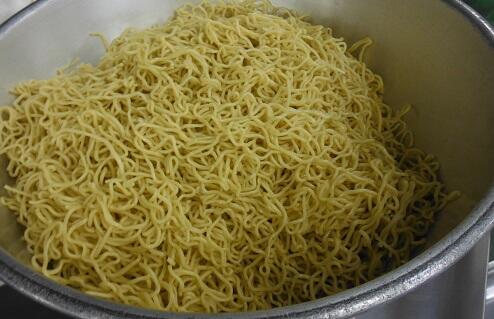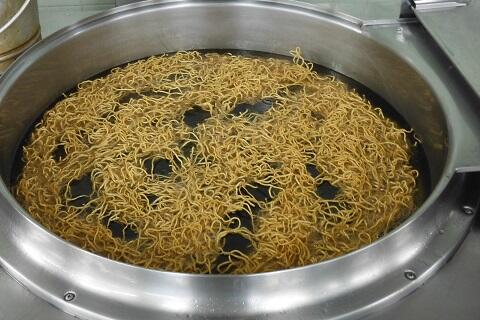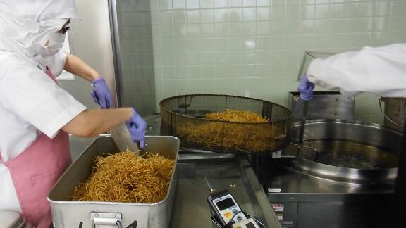 揚げ麺は、給食室で蒸し中華麺を180℃の油で約3~4分揚げています。少量ずつ揚げるので、全ての麺を揚げ終わるには2時間近くかかります。こんがり色がついてパリパリの食感に仕上がりました。