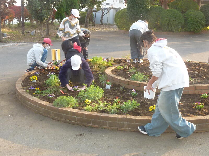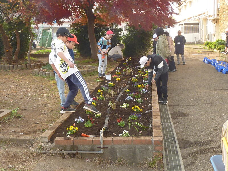 栽培委員会はパンジーやチューリップの球根を植えました。くるる花育ボランティアの方々が