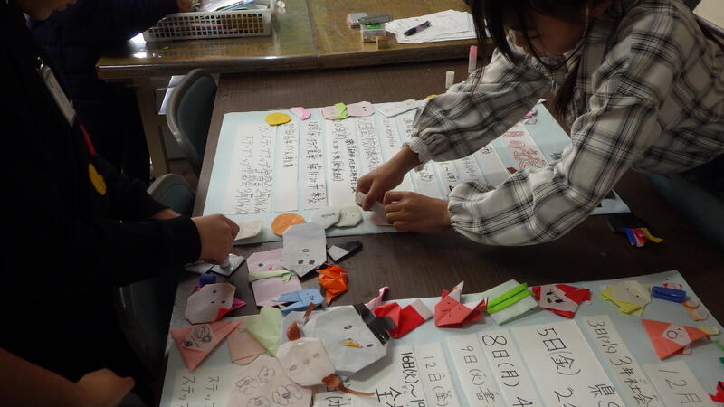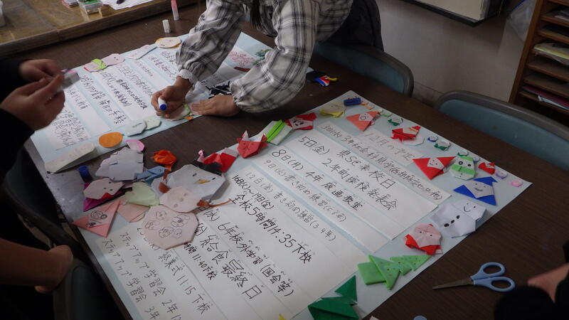 次は掲示・広報委員会です。月行事の掲示物に季節を感じる折り紙を取り付けていました。