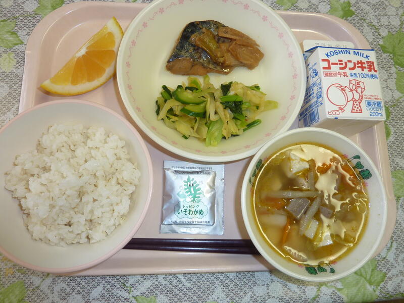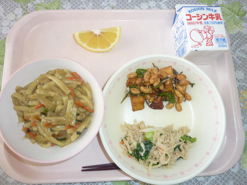 本日の献立は、カレーうどん、大豆と小魚の揚げ煮(芋入り)、切り干し大根の胡麻和え、はるか、牛乳です。