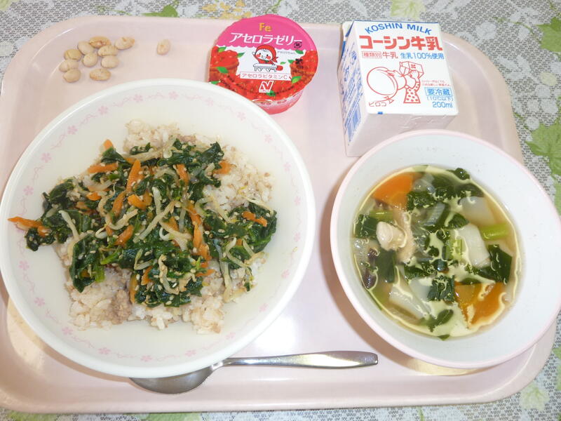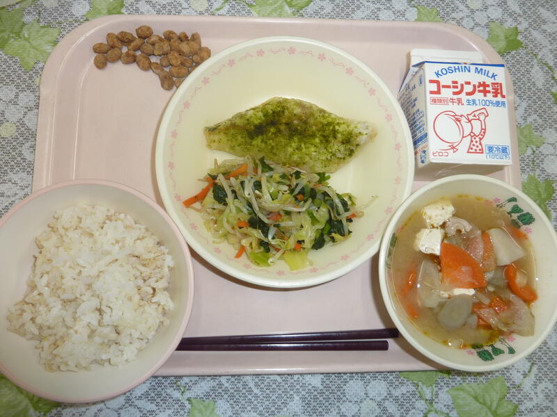本日の献立は、ごはん、タラの唐揚げ、おひたし、みそけんちん汁、黒糖ビーンズ、牛乳です。