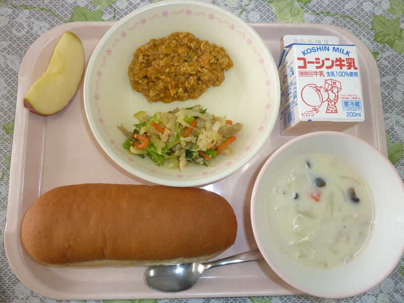 本日の献立は、セルフカレーミートサンド、ごぼうサラダ、いんげん豆のポタージュ、リンゴ、牛乳です。