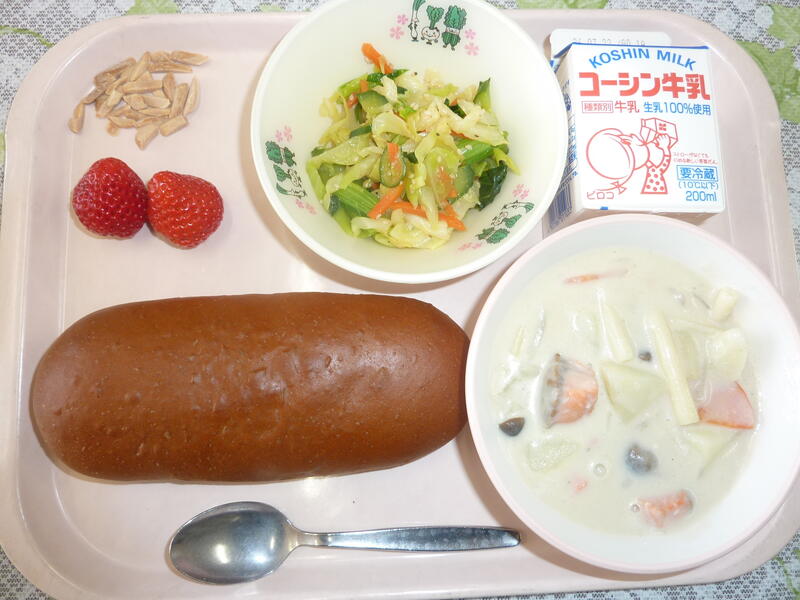 本日の献立は、黒パン、鮭のクリーム煮、バジルドレッシングサラダ、いちご、アーモンド、牛乳です。