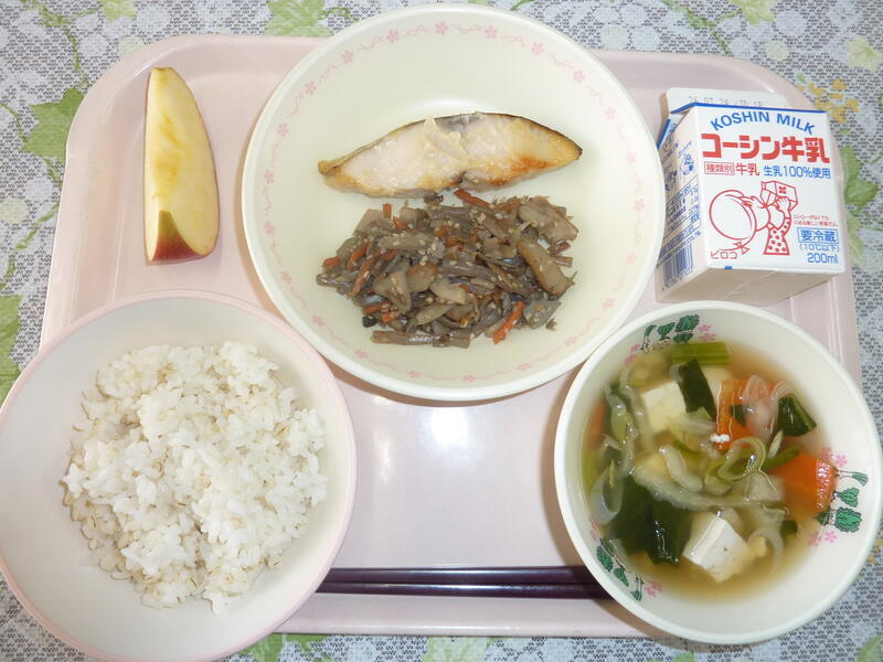 本日の献立は、ごはん、鰆の西京焼き、五目きんぴら、うずらの卵入りすまし汁、リンゴ、牛乳です。