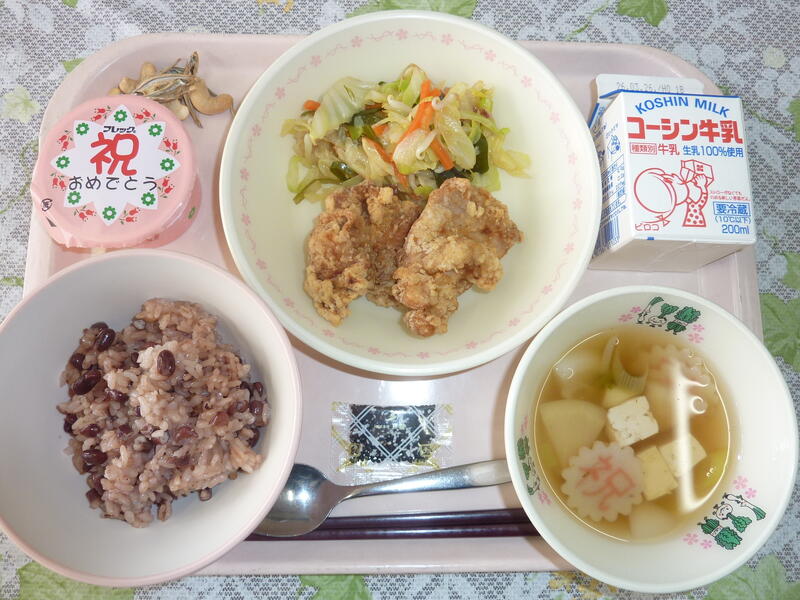 本日の献立は、赤飯、鶏肉の唐揚げ、海藻サラダ、かぶのお祝いお吸い物、お祝い紅白ゼリー、小魚カシューナッツ。牛乳です。