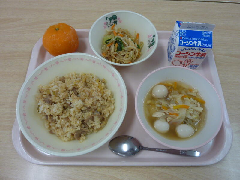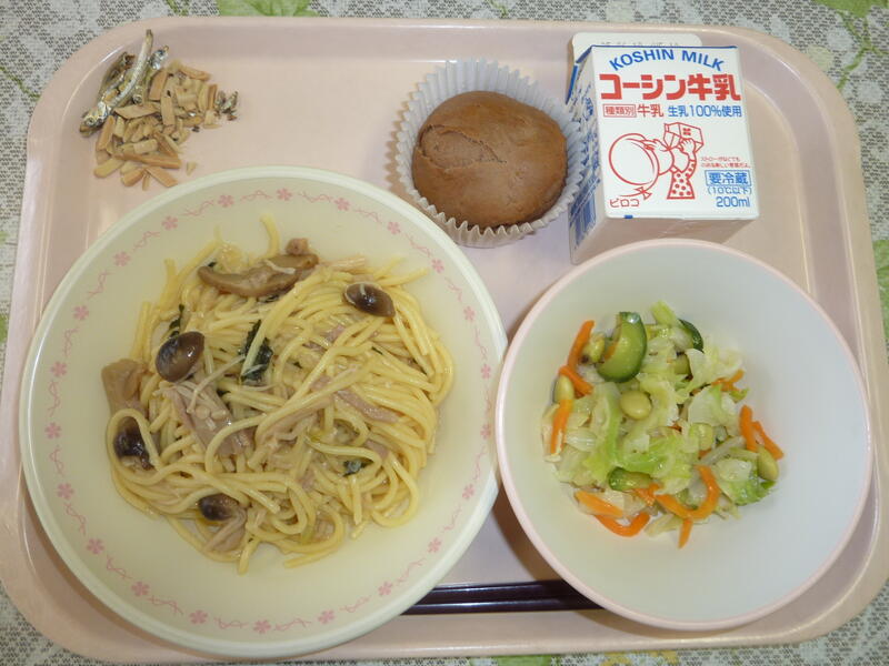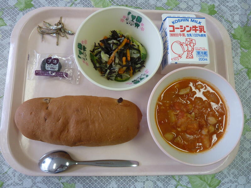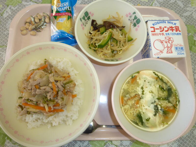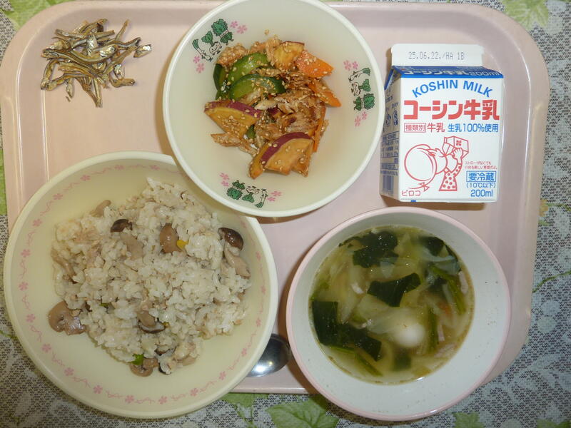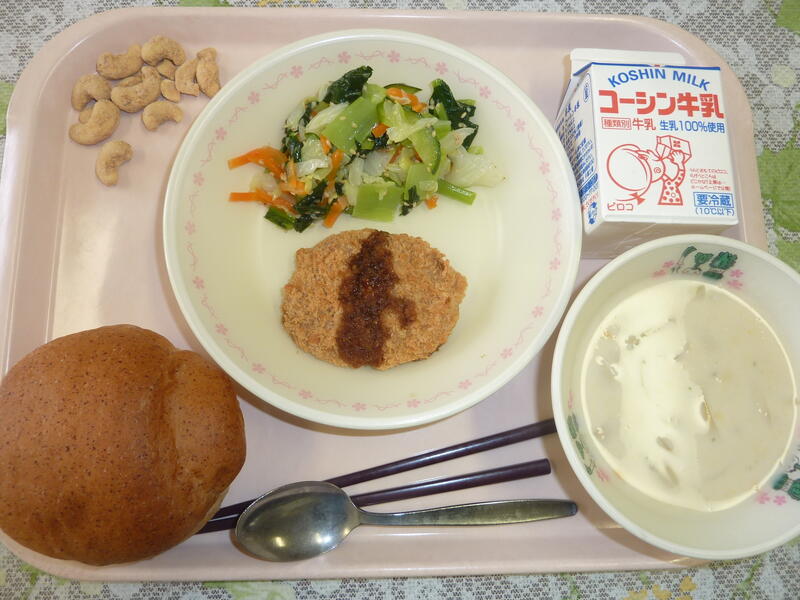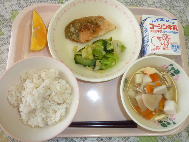 本日の給食は、ごはん、鶏肉の塩麹焼き、ピリ辛あえ、かぶのしまし汁、小魚のカシューナッツ、牛乳です。