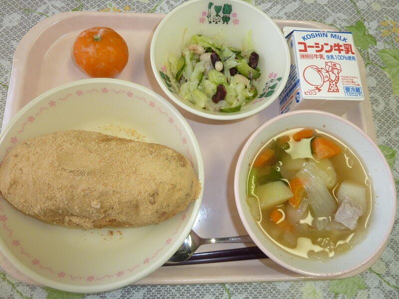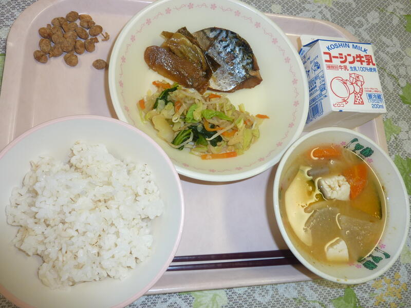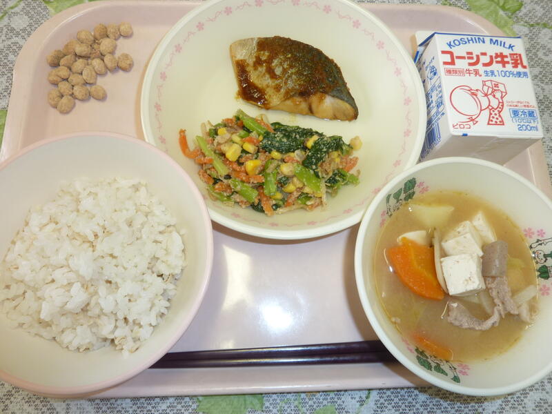 本日の献立は、ごはん、タラの唐揚げ、おひたし、みそけんちん汁、黒糖ビーンズ、牛乳です。