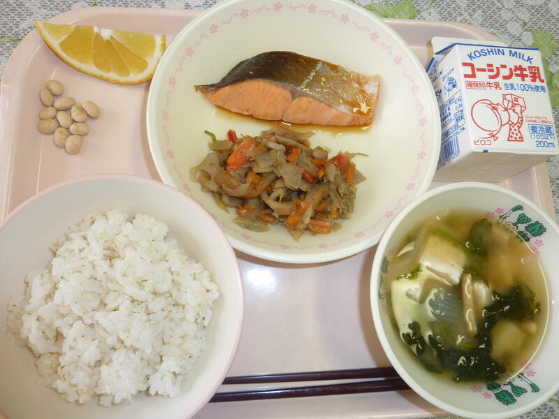 本日の献立は、ごはん、鰆の西京焼き、五目きんぴら、うずらの卵入りすまし汁、リンゴ、牛乳です。