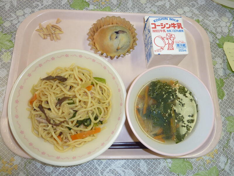本日の献立は、味噌煮込みうどん、柏野菜とひじきのあえもの、紅茶とりんごのマフィン、アーモンド、牛乳です。