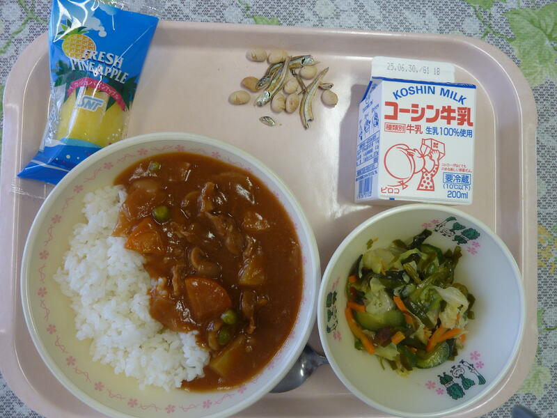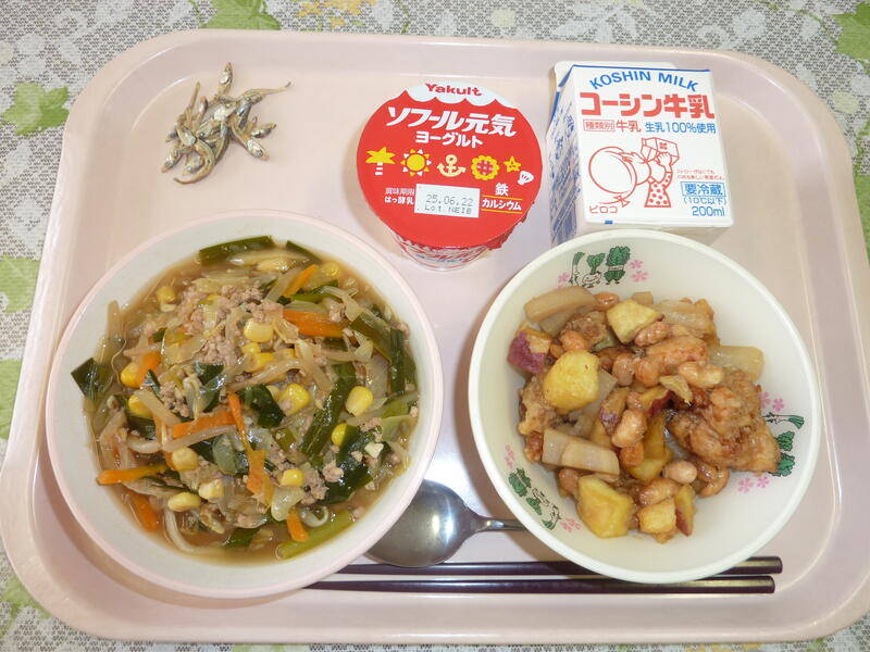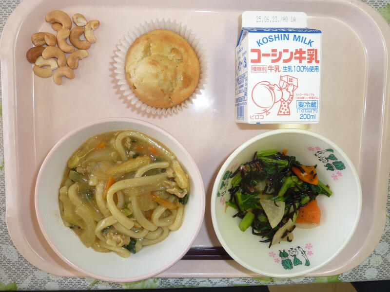 本日の献立は、カレーうどん、大豆と小魚の揚げ煮(芋入り)、切り干し大根の胡麻和え、はるか、牛乳です。