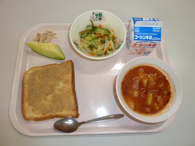 本日の献立は、ツナピラフ、ポテトグラタン、トマトと卵のスープ、アセロラゼリー、牛乳です。