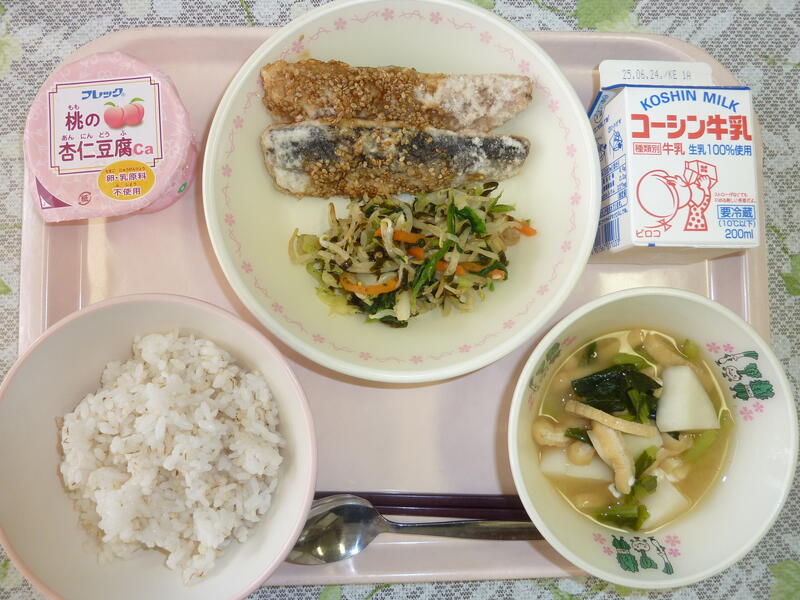 本日の献立は、ごはん、鰆のごまみそ焼き、からし和え、だまご汁、リンゴ、カシューナッツ、牛乳です。