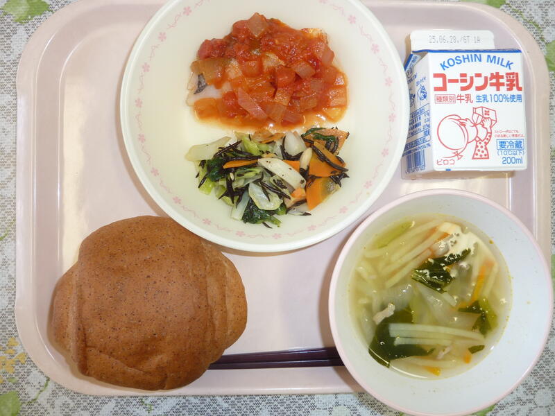 6年生の考えた献立は、班ごとに考えたものを、六小の先生たちに投票して選んだ献立です。メニューを考えてくれた6年1組の感謝して食べましょう。今日は骨骨注意報が出ています。「たらのとろみあんかけ」の魚には骨が入っている可能性があります。少しずつ、よく噛んで食べましょう。