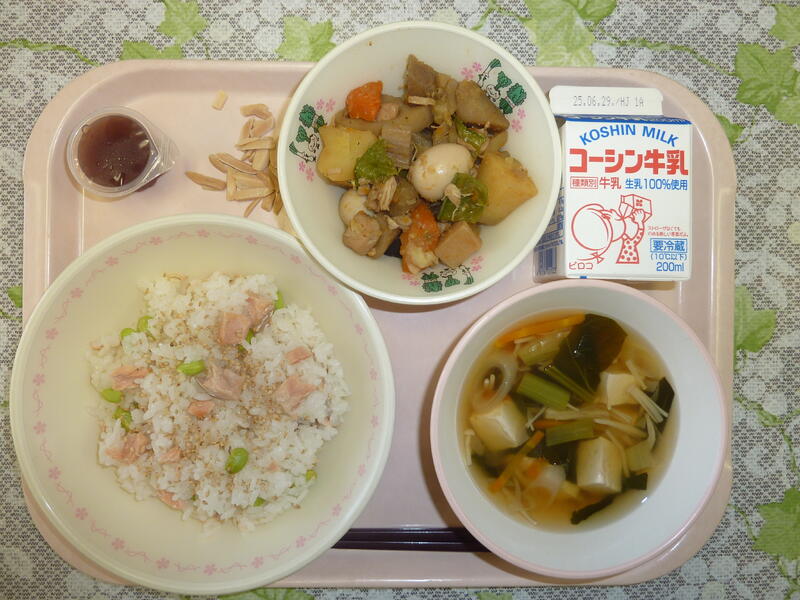 本日の献立は、赤飯、鶏肉の唐揚げ、海藻サラダ、かぶのお祝いお吸い物、お祝い紅白ゼリー、小魚カシューナッツ。牛乳です。