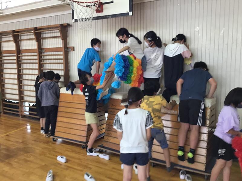 入学式の体育館の装飾を全員で力を合わせて外し,片付け作業をしました。