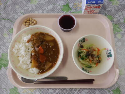 牛乳 ポークカレーライス しめじ入りサラダ グレープゼリー 炒り大豆