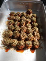 油で揚げて、ウスターソース、中濃ソースで作ったソースをかけて、削り節と