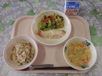 牛乳 ツナピラフ 鮭のマヨネーズ焼き 海そうサラダ コーンスープ