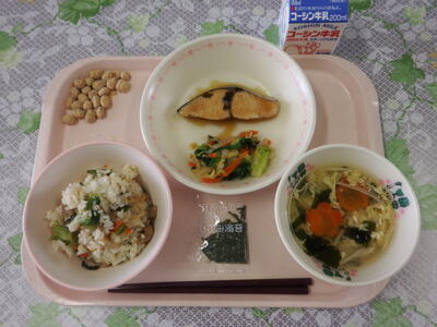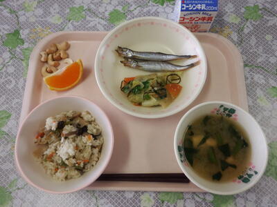 牛乳 五目御飯 ししゃも焼き 塩こんぶ和え ほうれん草と厚揚げのみそ汁