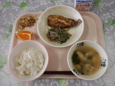 牛乳 ごはん いわしの蒲焼 ごま和え じゃがいものみそ汁 清見オレンジ じゃこナッツ