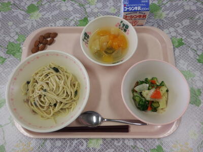 牛乳 カルボナーラ風スパゲティ テスト100点サラダ フルーツサイダーポンチ 粒アーモンド