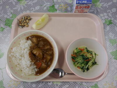 牛乳 ポークカレーライス ハニーマスタードドレッシングサラダ りんご 大豆小魚