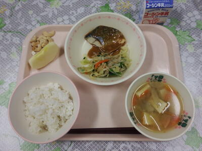 牛乳 鯖のごまだれ焼き おひたし 里芋の田舎汁 りんご カシューナッツ