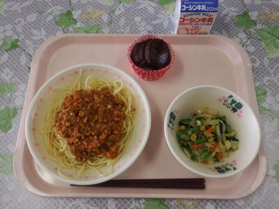 牛乳 スパゲティだいずソース バジルドレッシングサラダ 米粉のココアケーキ