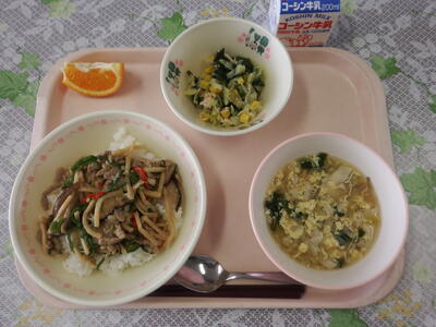 牛乳 チンジャオロースー丼 コーンサラダ ワンタンと卵のスープ いよかん